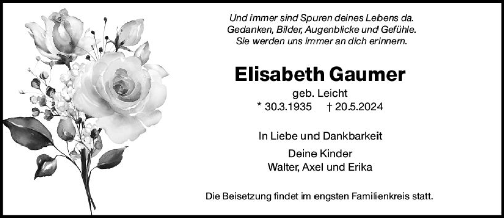 Hier finden Sie alle Traueranzeigen aus der Zeitung, die bisher für Elisabeth Gaumer erschienen sind. Weitere Traueranzeigen, die in der Zeitung erscheinen, werden hier ebenfalls aufgelistet