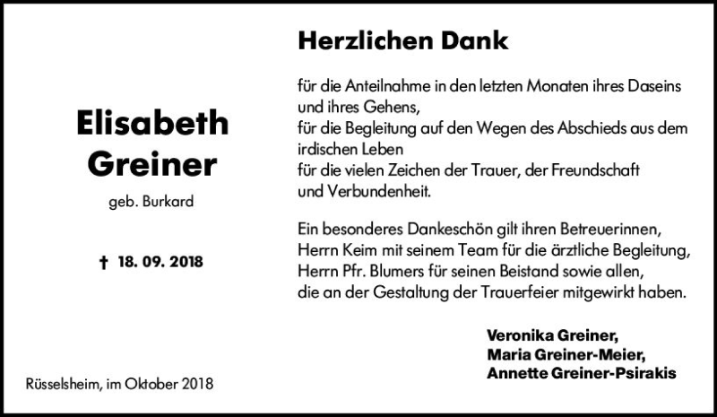 Hier finden Sie alle Traueranzeigen aus der Zeitung, die bisher für Elisabeth Greiner erschienen sind. Weitere Traueranzeigen, die in der Zeitung erscheinen, werden hier ebenfalls aufgelistet