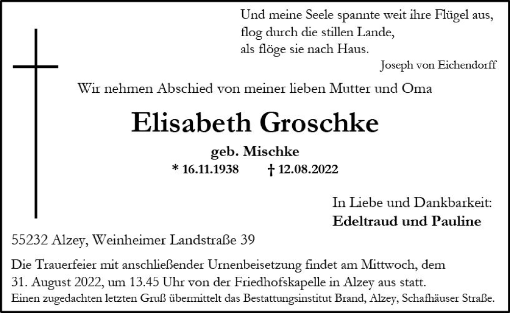 Hier finden Sie alle Traueranzeigen aus der Zeitung, die bisher für Elisabeth Groschke erschienen sind. Weitere Traueranzeigen, die in der Zeitung erscheinen, werden hier ebenfalls aufgelistet