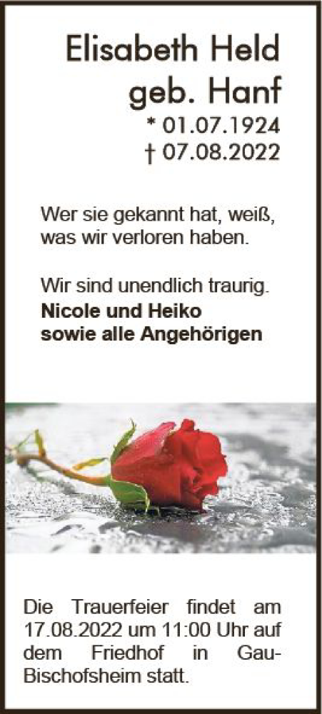 Hier finden Sie alle Traueranzeigen aus der Zeitung, die bisher für Elisabeth Held erschienen sind. Weitere Traueranzeigen, die in der Zeitung erscheinen, werden hier ebenfalls aufgelistet