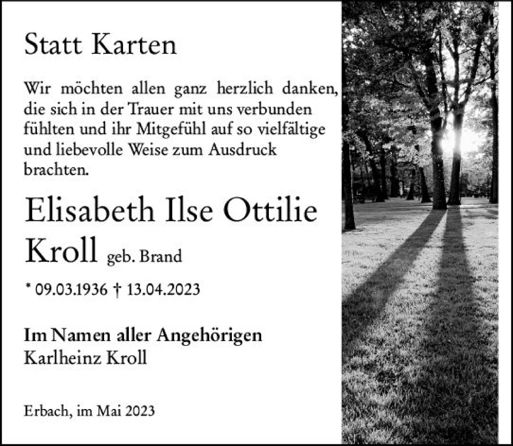 Hier finden Sie alle Traueranzeigen aus der Zeitung, die bisher für Elisabeth Ilse Ottilie Kroll erschienen sind. Weitere Traueranzeigen, die in der Zeitung erscheinen, werden hier ebenfalls aufgelistet