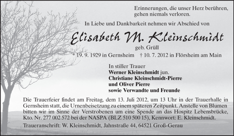 Hier finden Sie alle Traueranzeigen aus der Zeitung, die bisher für Elisabeth Kleinschmidt erschienen sind. Weitere Traueranzeigen, die in der Zeitung erscheinen, werden hier ebenfalls aufgelistet