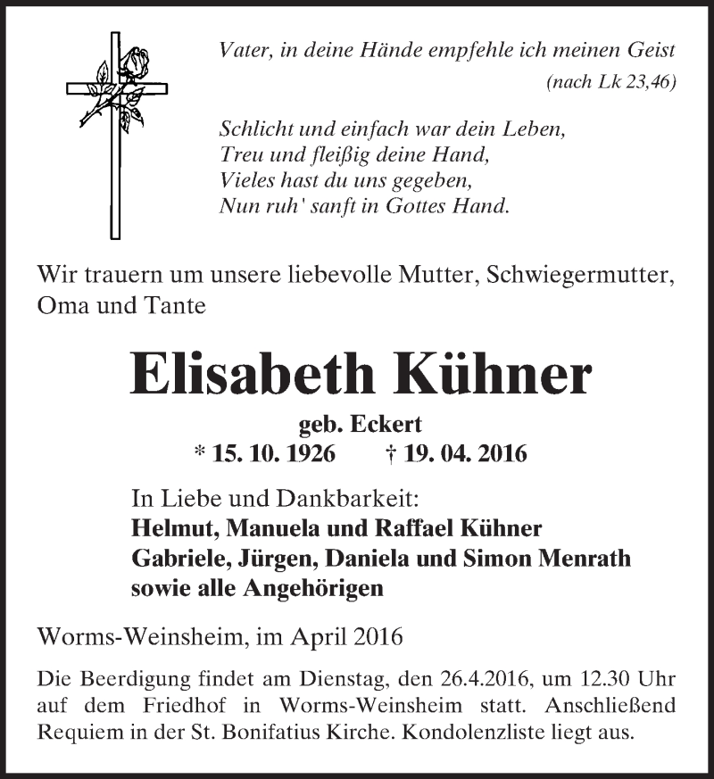 Hier finden Sie alle Traueranzeigen aus der Zeitung, die bisher für Elisabeth Kühner erschienen sind. Weitere Traueranzeigen, die in der Zeitung erscheinen, werden hier ebenfalls aufgelistet
