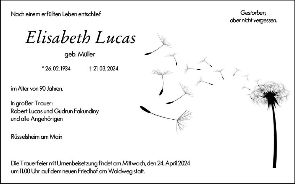 Hier finden Sie alle Traueranzeigen aus der Zeitung, die bisher für Elisabeth Lucas erschienen sind. Weitere Traueranzeigen, die in der Zeitung erscheinen, werden hier ebenfalls aufgelistet