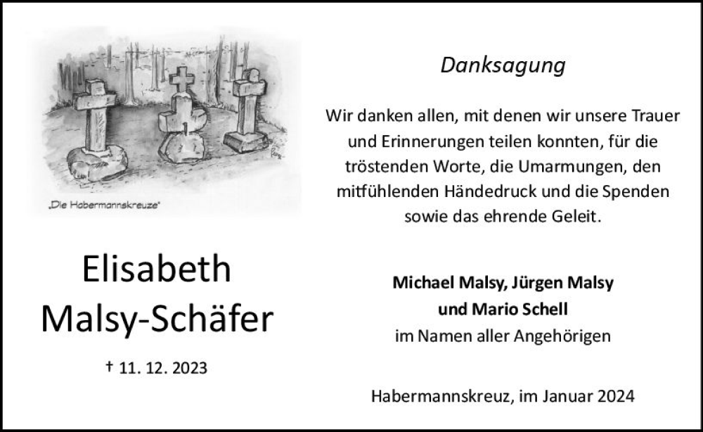 Hier finden Sie alle Traueranzeigen aus der Zeitung, die bisher für Elisabeth Malsy-Schäfer erschienen sind. Weitere Traueranzeigen, die in der Zeitung erscheinen, werden hier ebenfalls aufgelistet