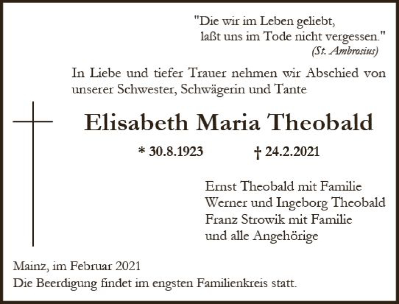 Hier finden Sie alle Traueranzeigen aus der Zeitung, die bisher für Elisabeth Maria Theobald erschienen sind. Weitere Traueranzeigen, die in der Zeitung erscheinen, werden hier ebenfalls aufgelistet