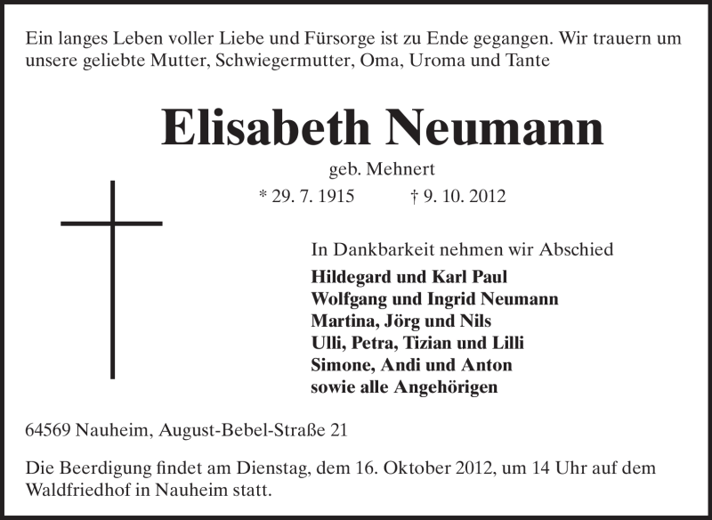 Hier finden Sie alle Traueranzeigen aus der Zeitung, die bisher für Elisabeth Neumann erschienen sind. Weitere Traueranzeigen, die in der Zeitung erscheinen, werden hier ebenfalls aufgelistet