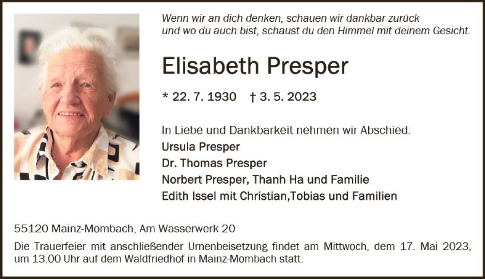 Hier finden Sie alle Traueranzeigen aus der Zeitung, die bisher für Elisabeth Presper erschienen sind. Weitere Traueranzeigen, die in der Zeitung erscheinen, werden hier ebenfalls aufgelistet