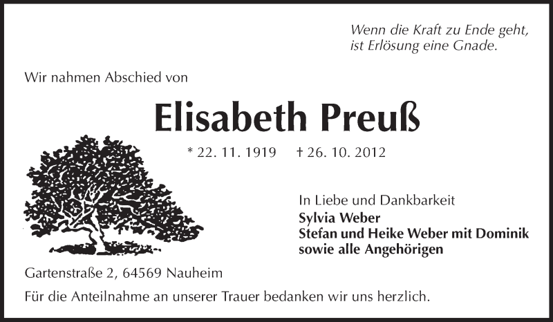 Hier finden Sie alle Traueranzeigen aus der Zeitung, die bisher für Elisabeth Preuß erschienen sind. Weitere Traueranzeigen, die in der Zeitung erscheinen, werden hier ebenfalls aufgelistet