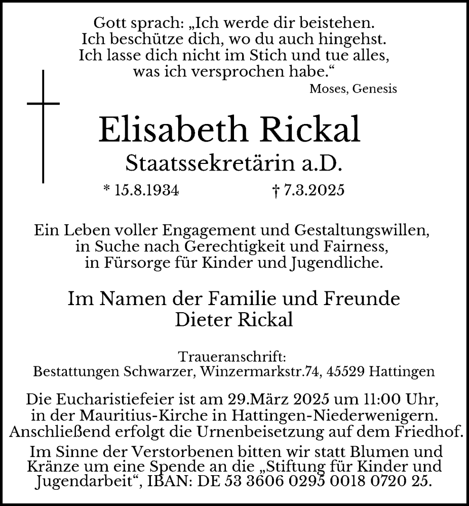 Hier finden Sie alle Traueranzeigen aus der Zeitung, die bisher für Elisabeth Rickal erschienen sind. Weitere Traueranzeigen, die in der Zeitung erscheinen, werden hier ebenfalls aufgelistet