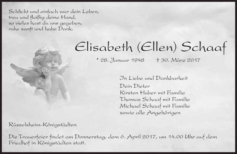 Hier finden Sie alle Traueranzeigen aus der Zeitung, die bisher für Elisabeth Schaaf erschienen sind. Weitere Traueranzeigen, die in der Zeitung erscheinen, werden hier ebenfalls aufgelistet