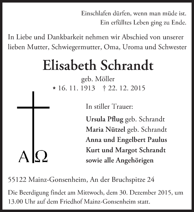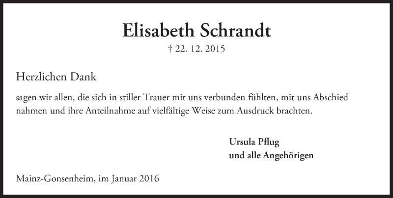 Hier finden Sie alle Traueranzeigen aus der Zeitung, die bisher für Elisabeth Schrandt erschienen sind. Weitere Traueranzeigen, die in der Zeitung erscheinen, werden hier ebenfalls aufgelistet