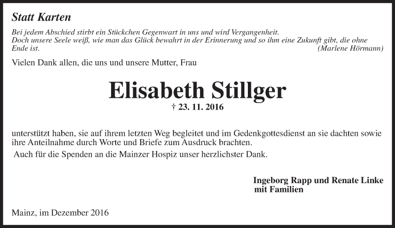 Hier finden Sie alle Traueranzeigen aus der Zeitung, die bisher für Elisabeth Stillger erschienen sind. Weitere Traueranzeigen, die in der Zeitung erscheinen, werden hier ebenfalls aufgelistet