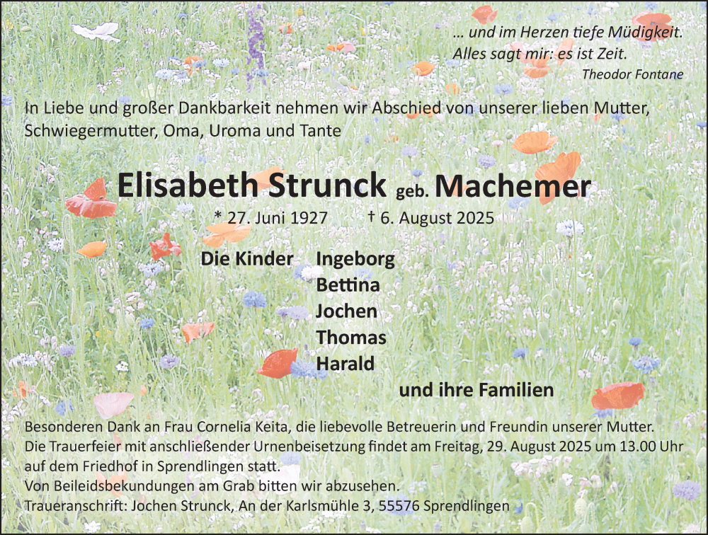 Hier finden Sie alle Traueranzeigen aus der Zeitung, die bisher für Elisabeth Strunck erschienen sind. Weitere Traueranzeigen, die in der Zeitung erscheinen, werden hier ebenfalls aufgelistet