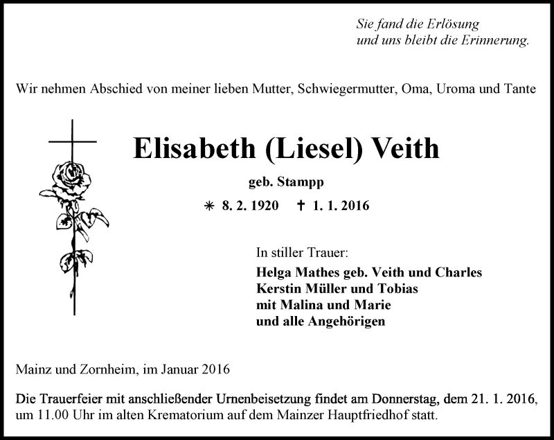 Hier finden Sie alle Traueranzeigen aus der Zeitung, die bisher für Elisabeth Veith erschienen sind. Weitere Traueranzeigen, die in der Zeitung erscheinen, werden hier ebenfalls aufgelistet