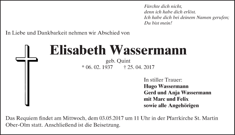 Hier finden Sie alle Traueranzeigen aus der Zeitung, die bisher für Elisabeth Wassermann erschienen sind. Weitere Traueranzeigen, die in der Zeitung erscheinen, werden hier ebenfalls aufgelistet