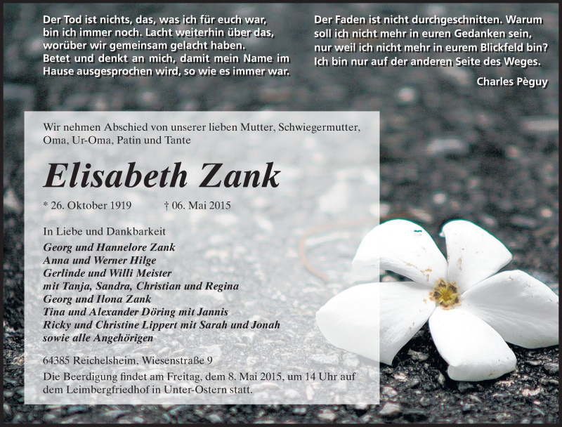 Hier finden Sie alle Traueranzeigen aus der Zeitung, die bisher für Elisabeth Zank erschienen sind. Weitere Traueranzeigen, die in der Zeitung erscheinen, werden hier ebenfalls aufgelistet