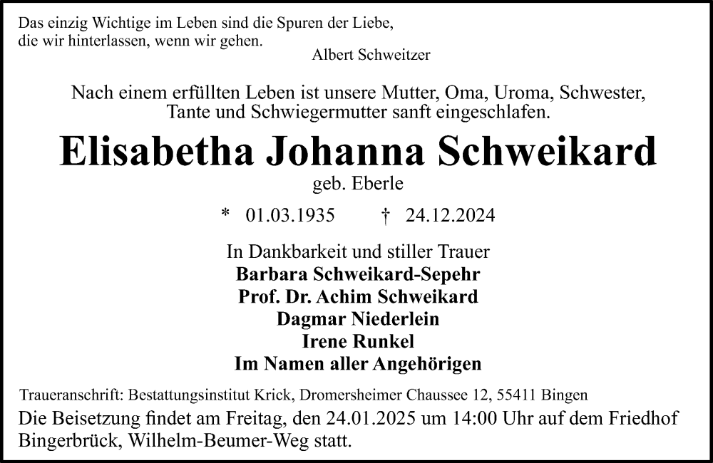 Hier finden Sie alle Traueranzeigen aus der Zeitung, die bisher für Elisabetha Johanna Schweikard erschienen sind. Weitere Traueranzeigen, die in der Zeitung erscheinen, werden hier ebenfalls aufgelistet