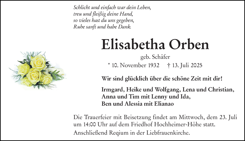 Hier finden Sie alle Traueranzeigen aus der Zeitung, die bisher für Elisabetha Orben erschienen sind. Weitere Traueranzeigen, die in der Zeitung erscheinen, werden hier ebenfalls aufgelistet