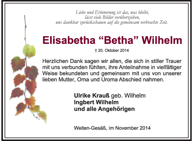 Hier finden Sie alle Traueranzeigen aus der Zeitung, die bisher für Elisabetha Wilhelm erschienen sind. Weitere Traueranzeigen, die in der Zeitung erscheinen, werden hier ebenfalls aufgelistet