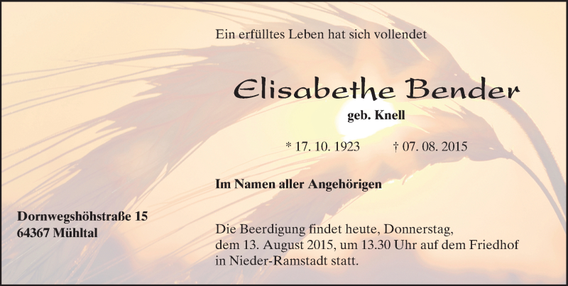 Hier finden Sie alle Traueranzeigen aus der Zeitung, die bisher für Elisabethe Bender erschienen sind. Weitere Traueranzeigen, die in der Zeitung erscheinen, werden hier ebenfalls aufgelistet