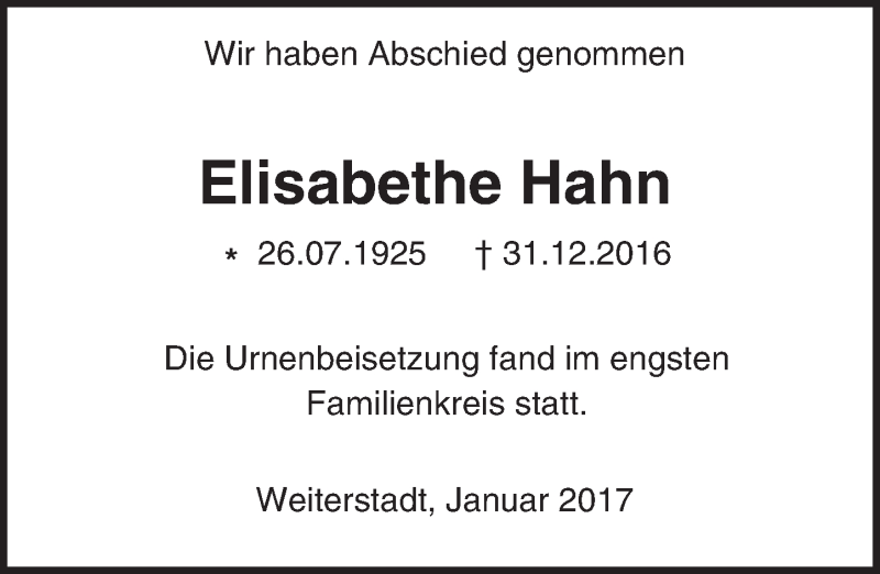 Hier finden Sie alle Traueranzeigen aus der Zeitung, die bisher für Elisabethe Hahn erschienen sind. Weitere Traueranzeigen, die in der Zeitung erscheinen, werden hier ebenfalls aufgelistet