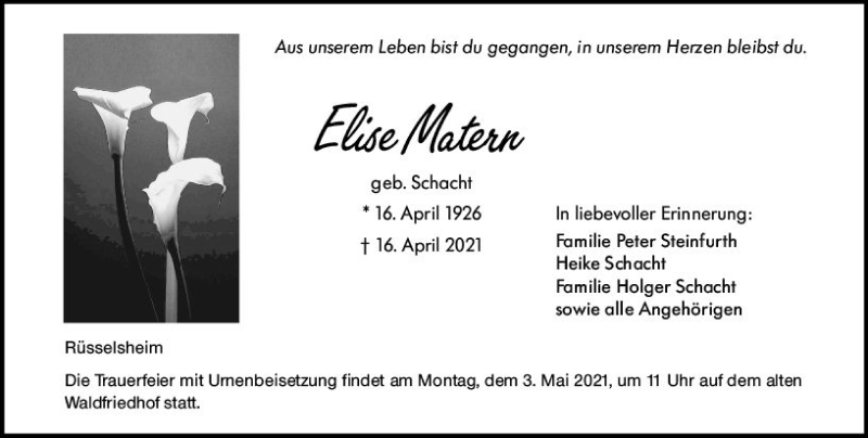 Hier finden Sie alle Traueranzeigen aus der Zeitung, die bisher für Elise Matern erschienen sind. Weitere Traueranzeigen, die in der Zeitung erscheinen, werden hier ebenfalls aufgelistet