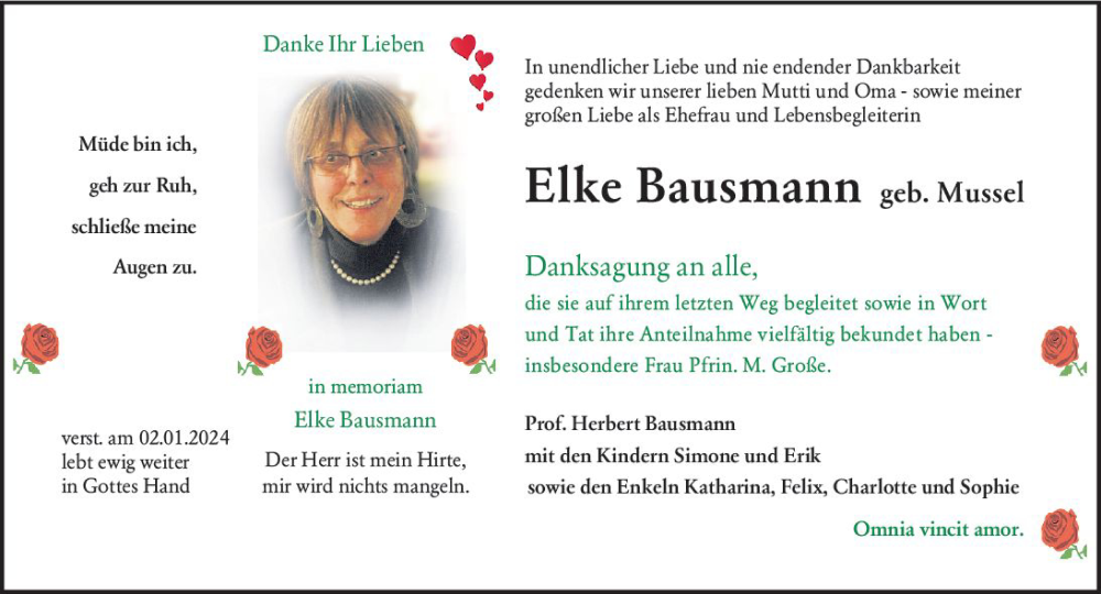 Hier finden Sie alle Traueranzeigen aus der Zeitung, die bisher für Elke Bausmann erschienen sind. Weitere Traueranzeigen, die in der Zeitung erscheinen, werden hier ebenfalls aufgelistet