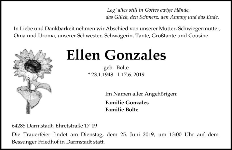 Hier finden Sie alle Traueranzeigen aus der Zeitung, die bisher für Ellen Gonzales erschienen sind. Weitere Traueranzeigen, die in der Zeitung erscheinen, werden hier ebenfalls aufgelistet