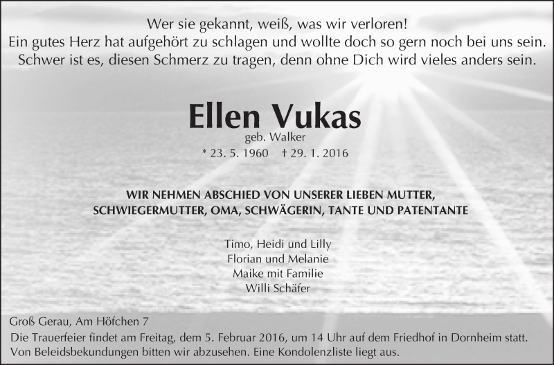 Hier finden Sie alle Traueranzeigen aus der Zeitung, die bisher für Ellen Vukas erschienen sind. Weitere Traueranzeigen, die in der Zeitung erscheinen, werden hier ebenfalls aufgelistet