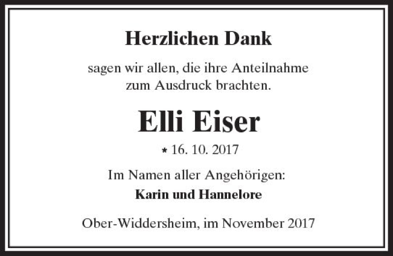 Hier finden Sie alle Traueranzeigen aus der Zeitung, die bisher für Elli Eiser erschienen sind. Weitere Traueranzeigen, die in der Zeitung erscheinen, werden hier ebenfalls aufgelistet