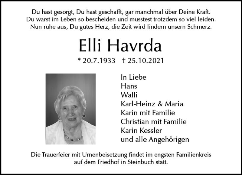 Hier finden Sie alle Traueranzeigen aus der Zeitung, die bisher für Elli Havrda erschienen sind. Weitere Traueranzeigen, die in der Zeitung erscheinen, werden hier ebenfalls aufgelistet