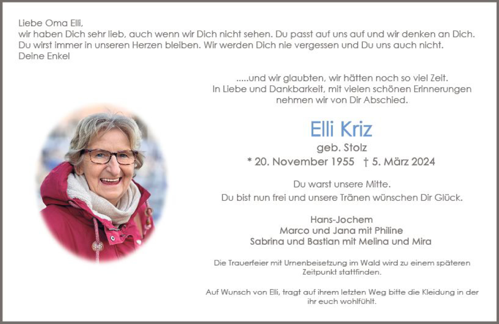 Hier finden Sie alle Traueranzeigen aus der Zeitung, die bisher für Elli Kriz erschienen sind. Weitere Traueranzeigen, die in der Zeitung erscheinen, werden hier ebenfalls aufgelistet