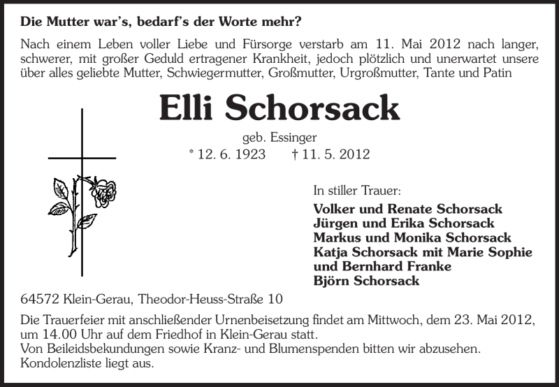 Hier finden Sie alle Traueranzeigen aus der Zeitung, die bisher für Elli Schorsack erschienen sind. Weitere Traueranzeigen, die in der Zeitung erscheinen, werden hier ebenfalls aufgelistet