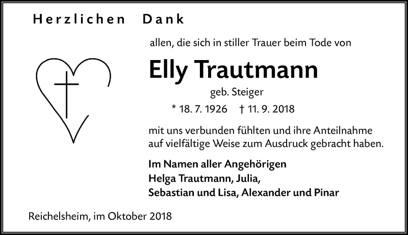 Hier finden Sie alle Traueranzeigen aus der Zeitung, die bisher für Elly Trautmann erschienen sind. Weitere Traueranzeigen, die in der Zeitung erscheinen, werden hier ebenfalls aufgelistet