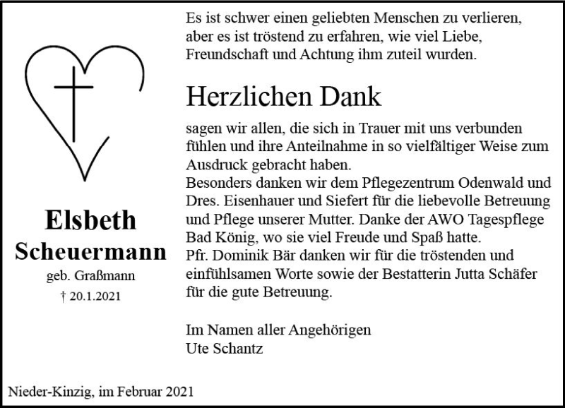 Hier finden Sie alle Traueranzeigen aus der Zeitung, die bisher für Elsbeth Scheuermann erschienen sind. Weitere Traueranzeigen, die in der Zeitung erscheinen, werden hier ebenfalls aufgelistet