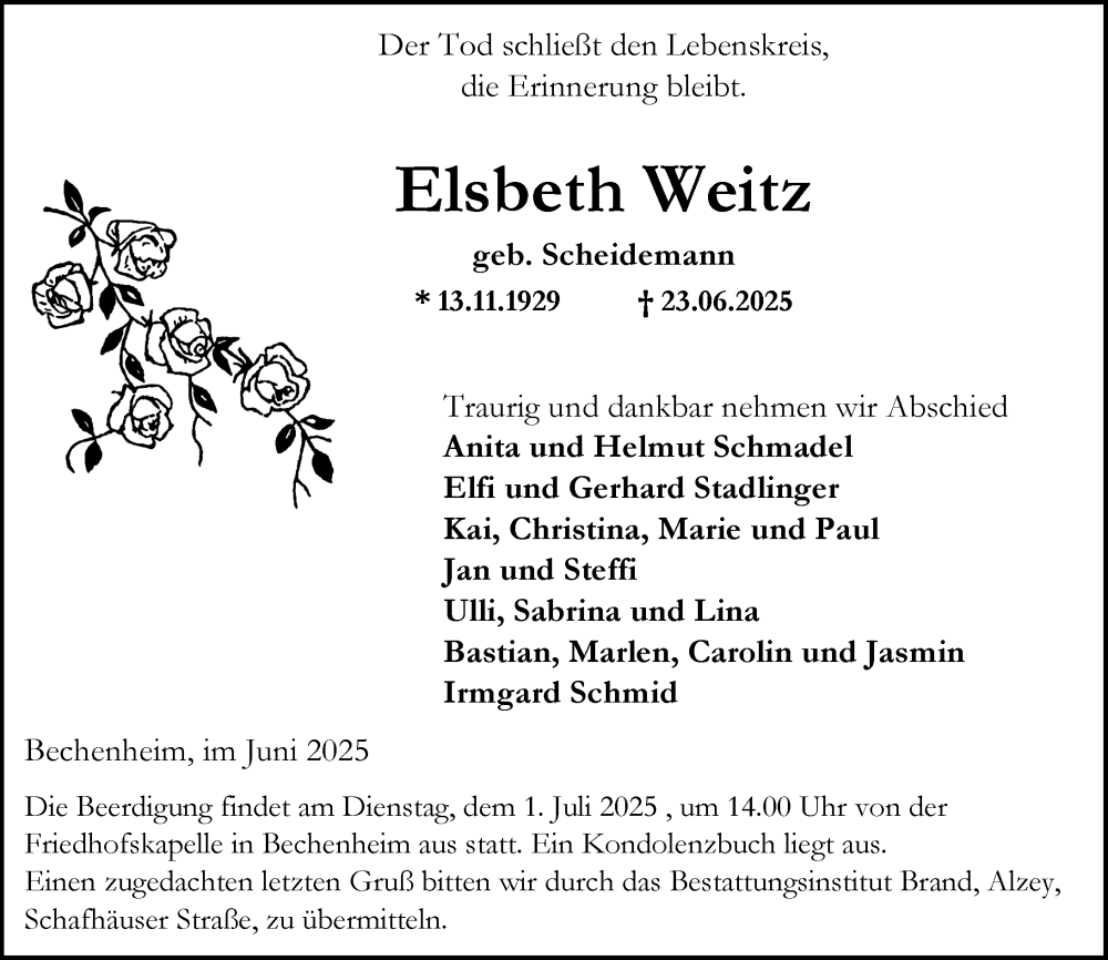 Hier finden Sie alle Traueranzeigen aus der Zeitung, die bisher für Elsbeth Weitz erschienen sind. Weitere Traueranzeigen, die in der Zeitung erscheinen, werden hier ebenfalls aufgelistet