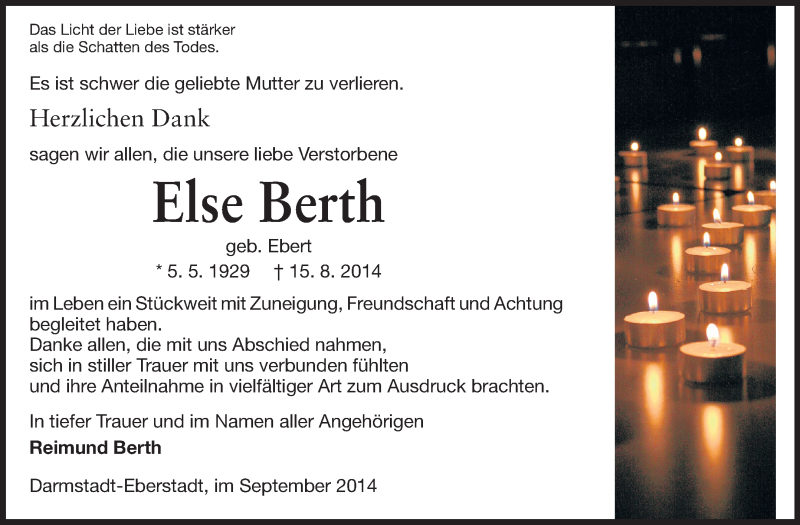 Hier finden Sie alle Traueranzeigen aus der Zeitung, die bisher für Else Berth erschienen sind. Weitere Traueranzeigen, die in der Zeitung erscheinen, werden hier ebenfalls aufgelistet