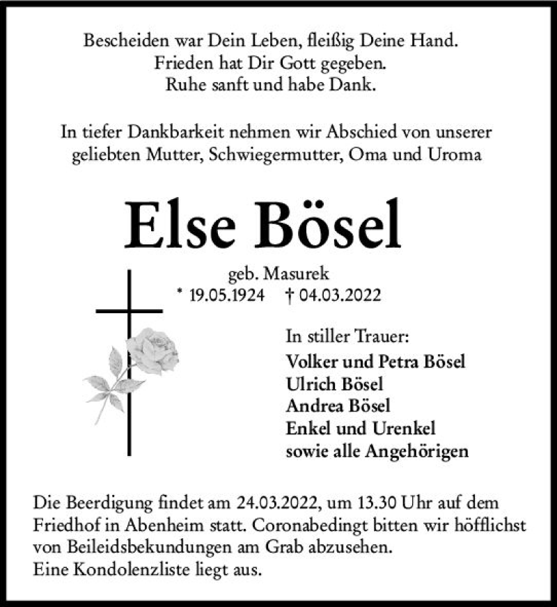 Hier finden Sie alle Traueranzeigen aus der Zeitung, die bisher für Else Böse erschienen sind. Weitere Traueranzeigen, die in der Zeitung erscheinen, werden hier ebenfalls aufgelistet