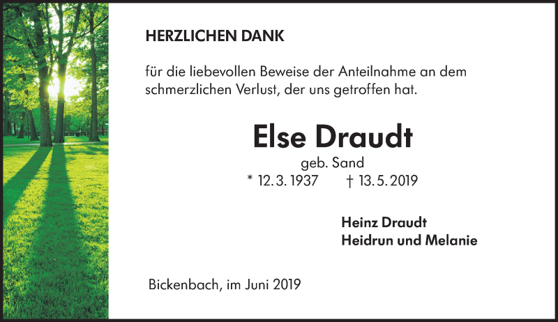 Hier finden Sie alle Traueranzeigen aus der Zeitung, die bisher für Else Draudt erschienen sind. Weitere Traueranzeigen, die in der Zeitung erscheinen, werden hier ebenfalls aufgelistet