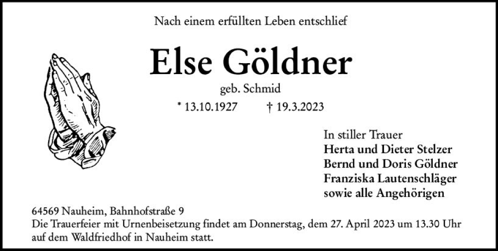 Hier finden Sie alle Traueranzeigen aus der Zeitung, die bisher für Else Göldner erschienen sind. Weitere Traueranzeigen, die in der Zeitung erscheinen, werden hier ebenfalls aufgelistet