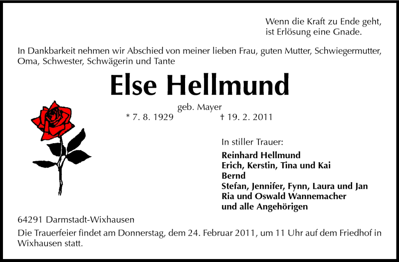 Hier finden Sie alle Traueranzeigen aus der Zeitung, die bisher für Else Hellmund erschienen sind. Weitere Traueranzeigen, die in der Zeitung erscheinen, werden hier ebenfalls aufgelistet