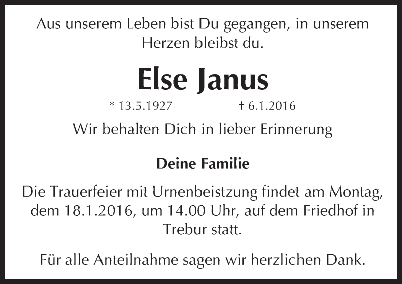 Hier finden Sie alle Traueranzeigen aus der Zeitung, die bisher für Else Janus erschienen sind. Weitere Traueranzeigen, die in der Zeitung erscheinen, werden hier ebenfalls aufgelistet