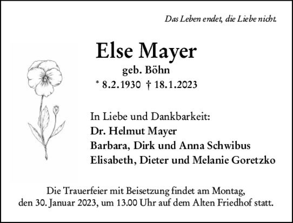 Hier finden Sie alle Traueranzeigen aus der Zeitung, die bisher für Else Mayer erschienen sind. Weitere Traueranzeigen, die in der Zeitung erscheinen, werden hier ebenfalls aufgelistet