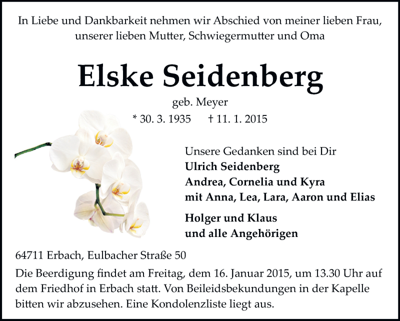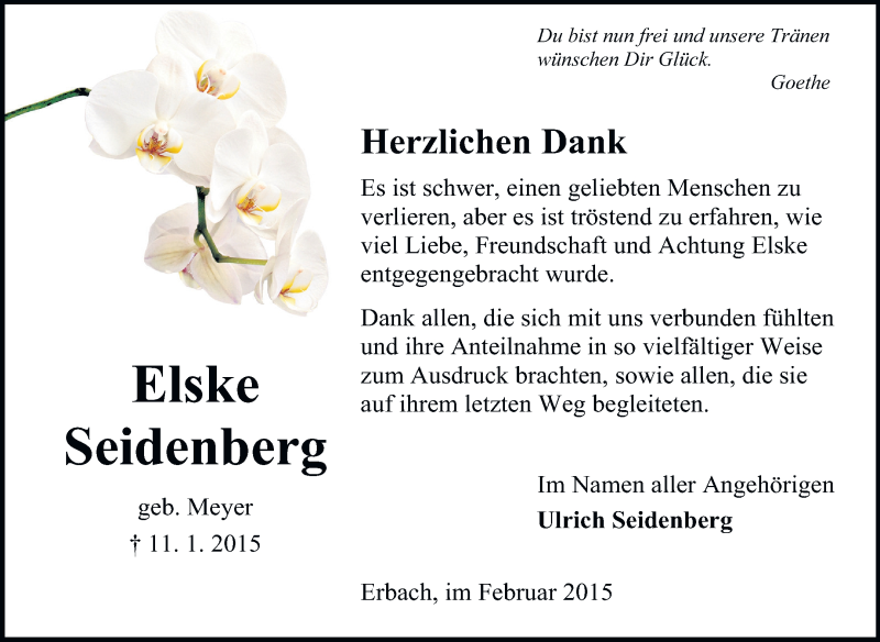 Hier finden Sie alle Traueranzeigen aus der Zeitung, die bisher für Elske Seidenberg erschienen sind. Weitere Traueranzeigen, die in der Zeitung erscheinen, werden hier ebenfalls aufgelistet