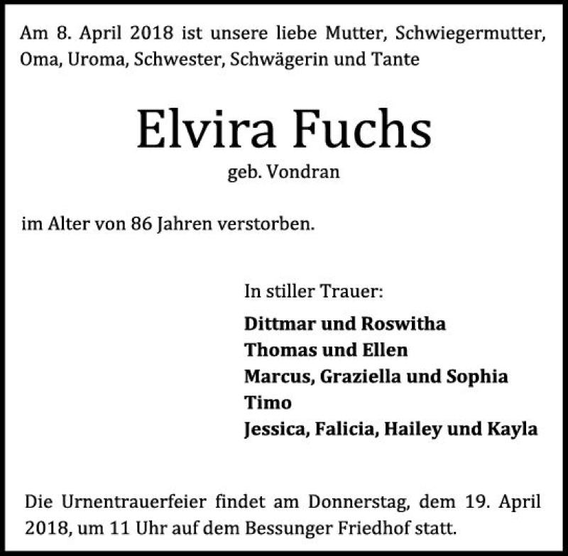 Hier finden Sie alle Traueranzeigen aus der Zeitung, die bisher für Elvira Fuchs erschienen sind. Weitere Traueranzeigen, die in der Zeitung erscheinen, werden hier ebenfalls aufgelistet
