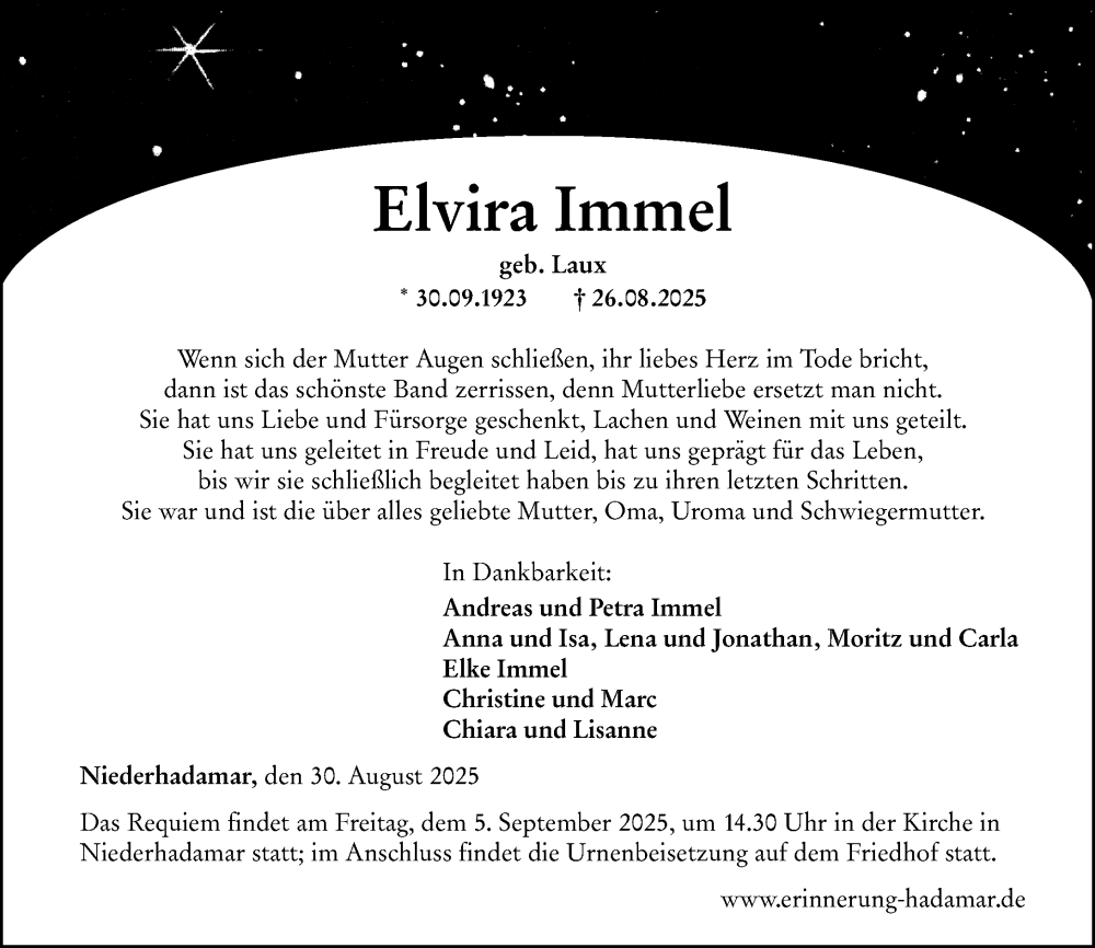 Hier finden Sie alle Traueranzeigen aus der Zeitung, die bisher für Elvira Immel erschienen sind. Weitere Traueranzeigen, die in der Zeitung erscheinen, werden hier ebenfalls aufgelistet