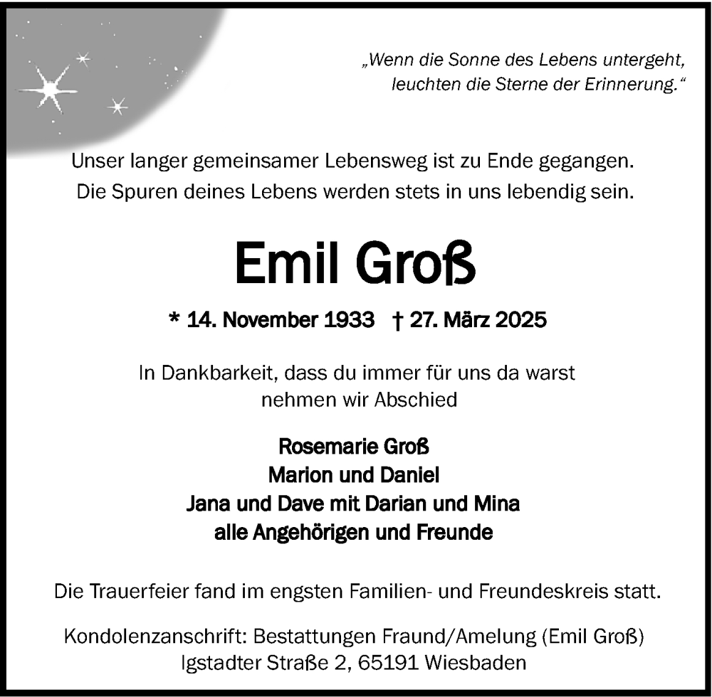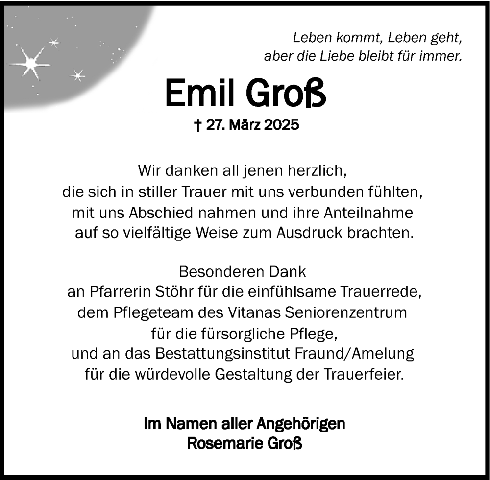 Hier finden Sie alle Traueranzeigen aus der Zeitung, die bisher für Emil Groß erschienen sind. Weitere Traueranzeigen, die in der Zeitung erscheinen, werden hier ebenfalls aufgelistet