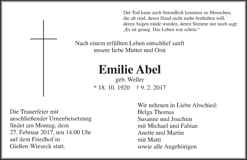 Hier finden Sie alle Traueranzeigen aus der Zeitung, die bisher für Emilie Abel erschienen sind. Weitere Traueranzeigen, die in der Zeitung erscheinen, werden hier ebenfalls aufgelistet