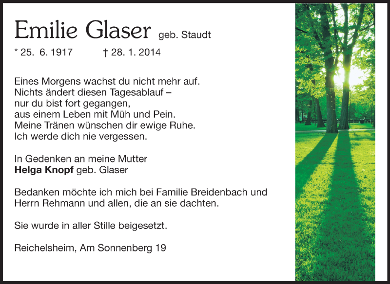 Hier finden Sie alle Traueranzeigen aus der Zeitung, die bisher für Emilie Glaser erschienen sind. Weitere Traueranzeigen, die in der Zeitung erscheinen, werden hier ebenfalls aufgelistet